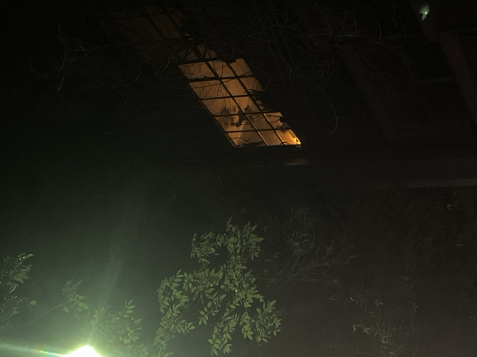 This nighttime image depicts an urban scene in Mexico City, Mexico. A bright, greenish-white artificial light source, likely a streetlamp, is visible in the upper left, partially obscured by green leafy foliage. To the right, a dark building features a large, gridded window section on an upper floor, illuminated from within by a warm, orange-yellow light. Several panes within this window appear broken or absent, revealing indistinct forms, potentially internal structures or overgrown vegetation, through the glowing interior. Bare tree branches and vines are prominent across the right side of the frame, partially obscuring the building. No individuals or discernible actions are present. The environment is dark, with selective artificial illumination.