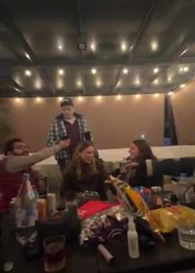 The video depicts a group of people sitting around a table in an outdoor setting, likely a patio or backyard, decorated with string lights. There are visible bottles of alcoholic beverages, snacks, and glasses on the table. One man is seen raising a bottle and drinking directly from it, while others are drinking from glasses. A woman with long blonde hair is holding a glass and speaking, seemingly commenting on the man's actions. The overall atmosphere seems to be celebratory or social.