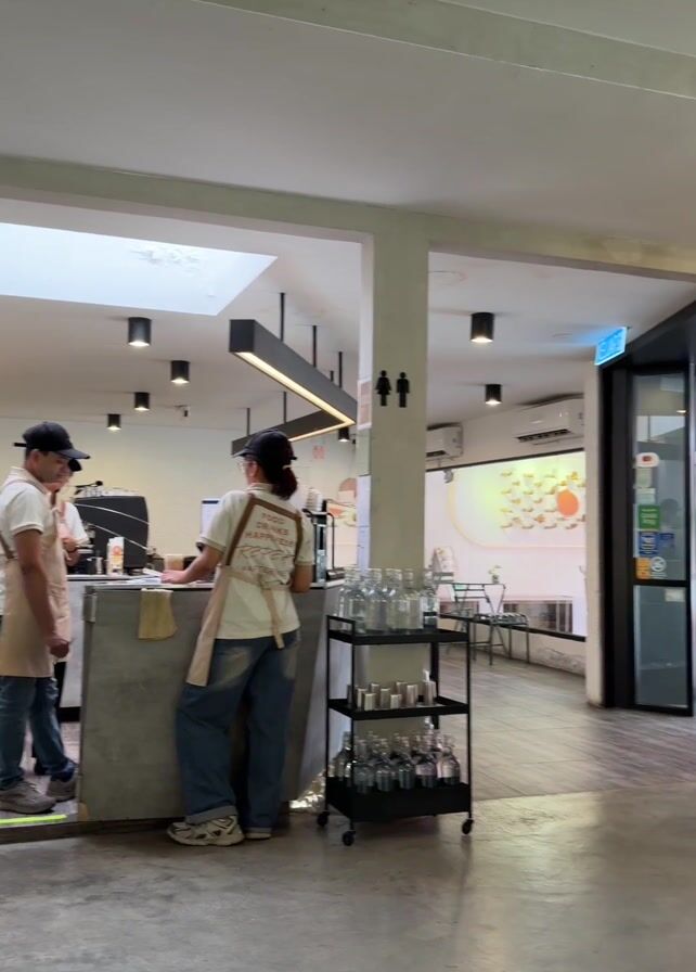 interior of a cafe. Two employees stand behind a grey concrete counter, presumably taking orders. A black metal cart with several glass bottles stands to the right of the counter. Further inside the cafe, two men are seated at separate tables. The first man sits at a round white table near a window, working or studying. The second man sits at a table closer to the wall, seemingly reading or working on something. The cafe has a modern, minimalist design with white walls, concrete floors, and simple furniture. Shelves with coffee-making equipment and decor are mounted on the wall. Art in the form of geometric shapes and minimalist line drawings are displayed on the wall. The atmosphere is bright and appears calm.