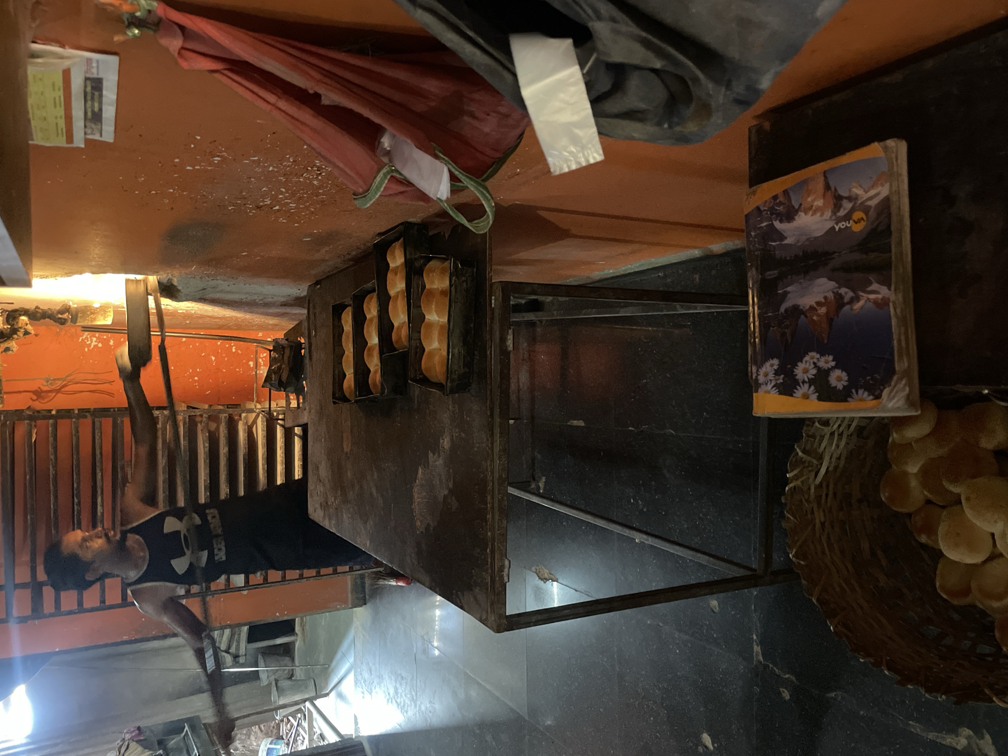 A rotated view depicts a street scene in Oxel, India. A man wearing a black tank top stands near a metal structure, possibly working on or interacting with it. On the structure, there are trays of baked goods. Next to it is a basket filled with what appears to be freshly baked bread. A notebook is placed near the bread basket. Above the structure, there are hanging bags and fabric. The background shows an orange-painted wall and a metal gate. The floor is tiled.
