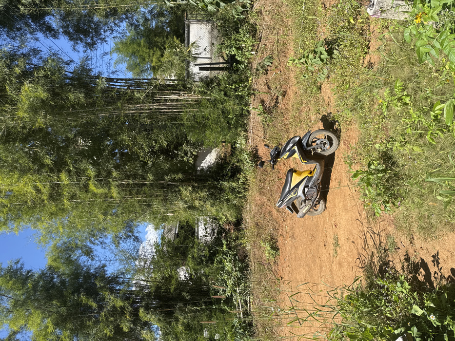 Two yellow and black motorcycles are parked on a dirt path surrounded by lush green vegetation. Bamboo trees tower in the background, reaching toward a clear blue sky. A partially visible white building is nestled amongst the trees. The scene is bathed in bright sunlight, creating strong shadows around the motorcycles. The terrain appears slightly uneven, typical of a natural outdoor setting.