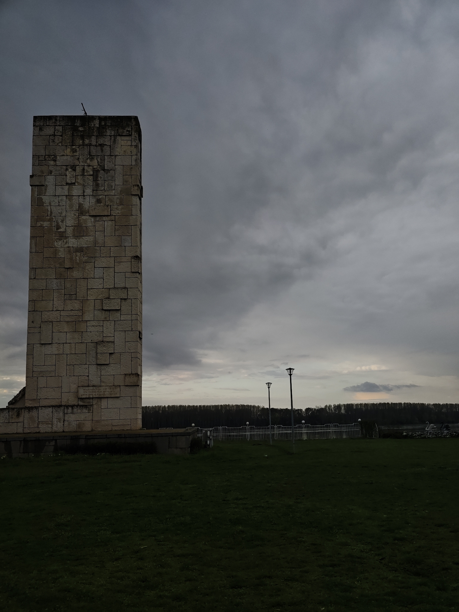 A somber, overcast scene in Kozloduy, Bulgaria features a tall, rectangular stone monument made of stacked, irregularly shaped blocks. The monument stands on a low, dark base, and the top is capped with a small, dark, possibly metallic element. An inscription is partially visible on one side of the monument near the base. In the background, a row of dense trees lines the horizon under the gray, heavily clouded sky. A white fence runs parallel to the trees, with two old-fashioned lampposts standing on the grass in front of it. The foreground is a dark, grassy field that extends to the bottom of the frame. The overall light is dim, contributing to the subdued atmosphere. The location is identified as Kozloduy, Bulgaria.