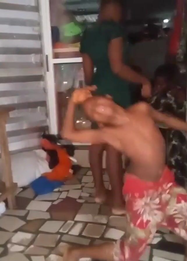 A video shows a shirtless person in floral pants on a tiled floor, moving erratically on their hands and knees and appearing distressed, with several other people standing around. One person, wearing a green dress, stands near the person on the floor. There is a small child lying on a pillow in the background. The room seems to be an indoor space, possibly a home, with a sliding glass door visible. The overall atmosphere appears tense and concerning.