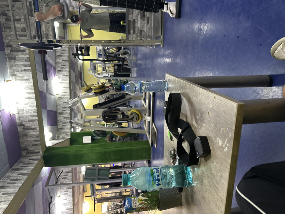 The image depicts the interior of a gymnasium in Karlovo, Bulgaria. In the foreground, a light-colored wooden table holds a plastic bottle of Velingrad mineral water, a small potted plant, a black athletic strap, a dark grey electronic device, keys, and a wristwatch. A person's lower leg and foot, wearing dark athletic pants with a white stripe, are visible at the bottom left, indicating a seated perspective. The floor is blue. In the midground, a plastic bottle of Devin mineral water stands on the blue floor. Towards the right, a male individual, wearing a dark baseball cap, a light green t-shirt, and dark patterned shorts, is performing a squat exercise with a barbell on his shoulders within a metal squat rack. His reflection is visible in a large mirror positioned behind him. Partially visible on the far right are the lower legs and feet of another individual, dressed in dark patterned trousers and white athletic shoes, standing near the squat rack. The background reveals an array of gym equipment, including various weight machines, benches, and colored weight plates (yellow, black, red). A tall, green artificial-grass-textured pillar stands in the left midground. The ceiling features a checkerboard pattern of purple squares and light grey faux-wood panels, with additional light grey paneling on the upper walls, illuminated by overhead fluorescent lights.