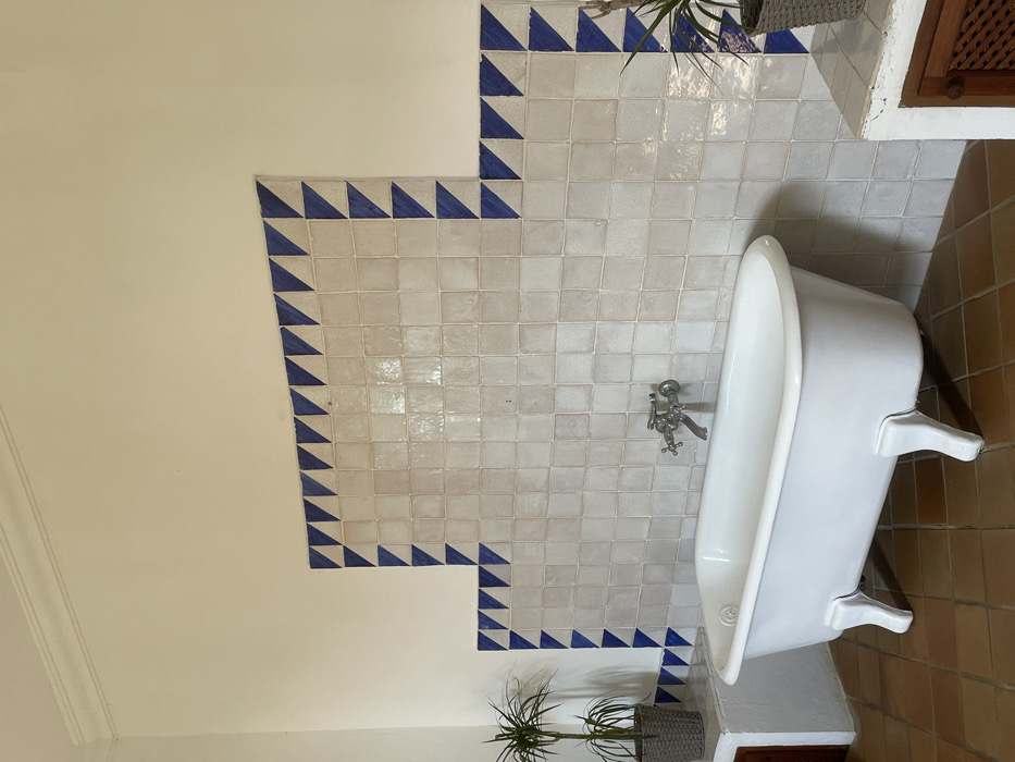This image depicts a static interior scene within a bathroom in Bunyola, Spain. The central focus is a white clawfoot bathtub with four white support legs, positioned on a floor composed of square, reddish-brown terracotta tiles. Behind the bathtub, the wall is covered with square, off-white tiles arranged in a rectilinear pattern, framed by a decorative border of dark blue triangles pointing inward. A chrome-finished, wall-mounted faucet set with two cross-handle taps is installed above the bathtub, centered on the tiled wall. The upper portion of the wall is painted a light cream color, meeting the ceiling with a white crown molding. To the left of the bathtub, a low, built-in structure with a white top surface holds a potted plant with green foliage in a gray woven pot. A similar, partially visible structure on the right side also supports a potted plant and features a dark wooden or wicker panel. No individuals or active interactions are present in the scene.