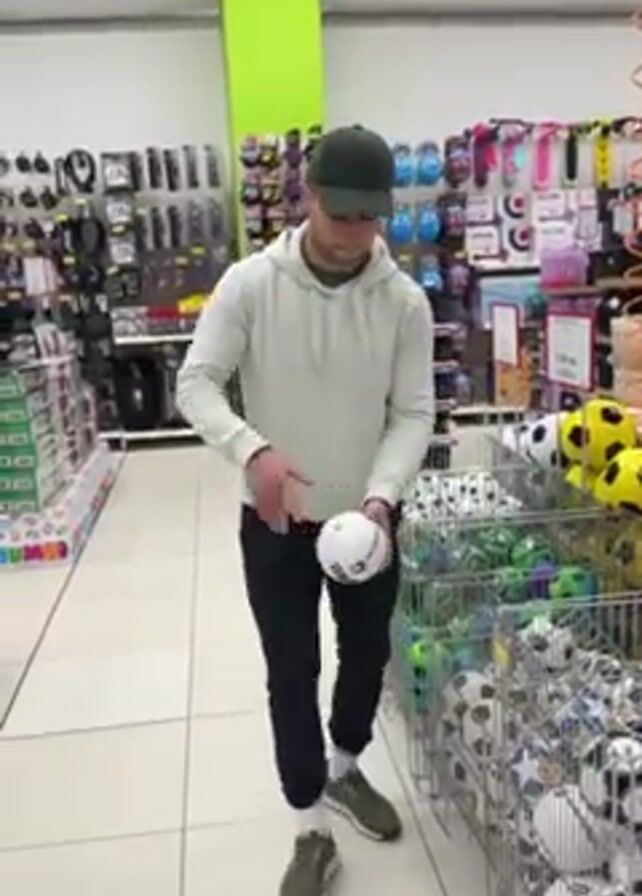 A man in a light-colored hoodie, dark pants, and a cap stands in a store aisle. He takes a white soccer ball from a cart full of balls. He briefly juggles the ball with his hands, then throws it up in the air. He turns his head to the side as the ball flies. The store aisle has shelves of merchandise on either side. There are also other carts of soccer balls in the aisle. The floor is tiled.