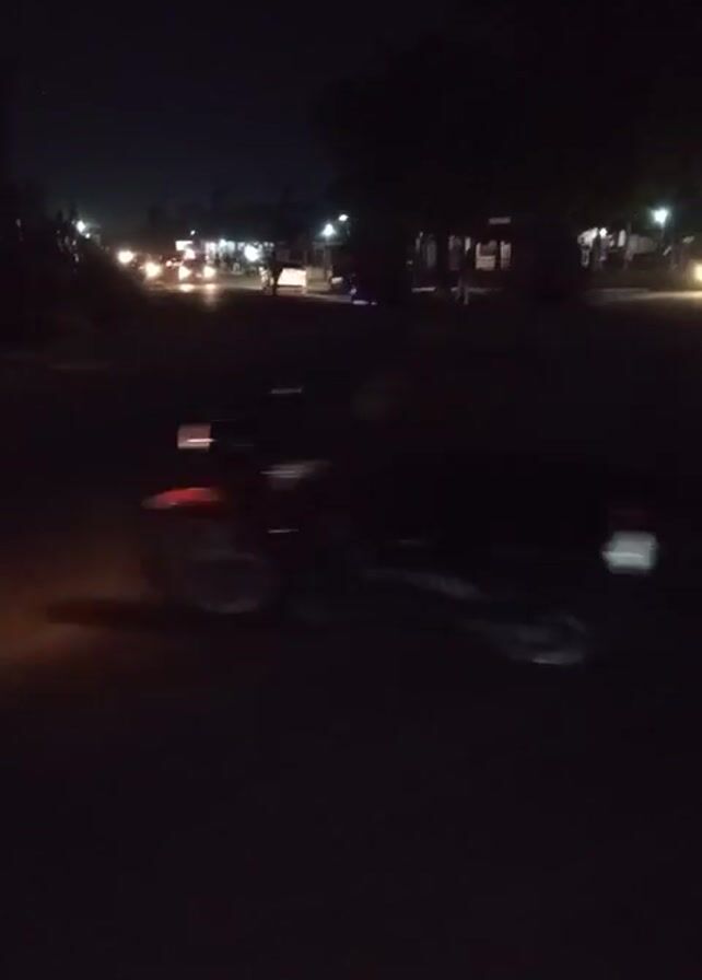 nighttime street scene with limited visibility. Streetlights illuminate a roadway, and several vehicles, including cars and scooters, are visible with their headlights on. Figures of people are present on the side of the road. The scene is largely dark, with the streetlights and vehicle headlights providing the primary illumination. The camera is stationary.