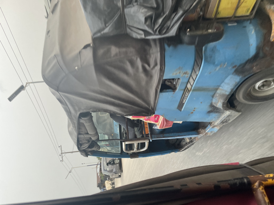 The scene depicts a street in Ohoro, Nigeria, under an overcast sky. The image is taken from inside a moving vehicle, showing its maroon and yellow interior frame on the left. To the right, a light blue, three-wheeled auto-rickshaw, identified by the "DELUXE" decal on its side, is in motion. This auto-rickshaw exhibits significant rust and wear, particularly on its lower body panels, and features a black canvas roof. An individual, presumably the driver, is partially visible in the driver's seat, with a red and white plastic bag hanging inside the compartment. In the background, other vehicles, including a silver sedan with a rear-mounted spare tire, are visible on a paved road. Utility poles with overhead power lines, a modern solar-powered street light, and several low-rise structures with corrugated metal roofs line the left side of the road. The overall environment suggests a bustling, semi-urban area.