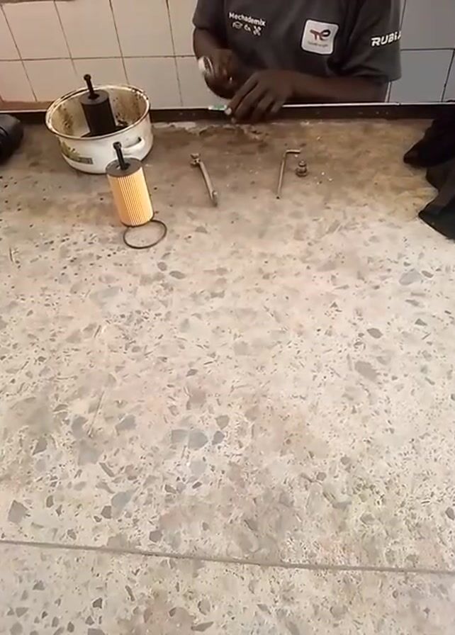 A person wearing a gray t-shirt with the logos "Mechadmix" and "TotalEnergies" is visible from the waist up, standing behind a speckled gray counter. The person is using a small brush on a silver metal object. On the counter to the left are a dirty white pot with a black object inside, an orange oil filter, and a black rubber o-ring. Also on the counter are two silver metal levers. To the right of the person, a pair of black gloves are visible. The wall behind the counter is white and tiled. The sound of hammering is audible.