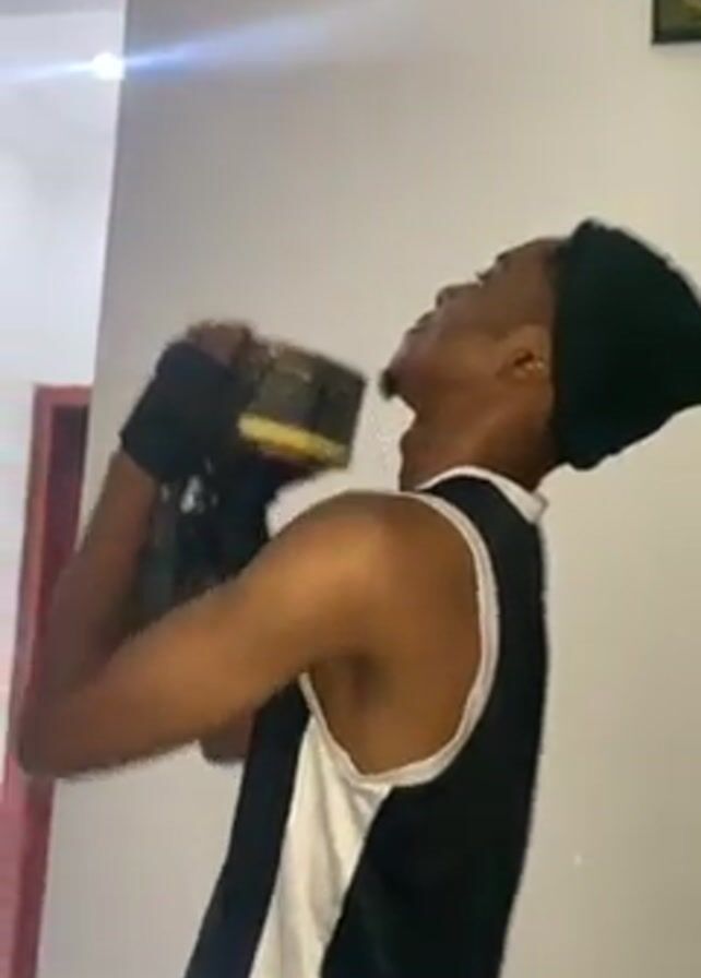 A man wearing a black beanie, a white tank top with black trim, and black wristbands is standing indoors in front of a white wall. He is lifting a gray and yellow cylinder-shaped object over his head and towards the ceiling. He is facing towards the side, with his head tilted upward. A door is visible in the background to the left. There is a framed picture on the wall to the right.