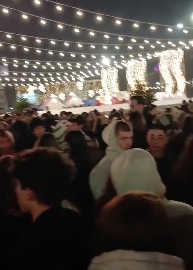 large crowd of people gathered in an outdoor space at night. There are numerous string lights overhead, illuminating the area, and at least one large decorative structure resembling a Christmas tree can be seen. The crowd seems to be moving around, with individuals chatting and looking in different directions. In the background, there are structures resembling carnival rides or stalls, suggesting a festive event or fair is taking place. Smoke is visible in the air, possibly from concessions or other activities. The overall atmosphere appears lively and crowded.