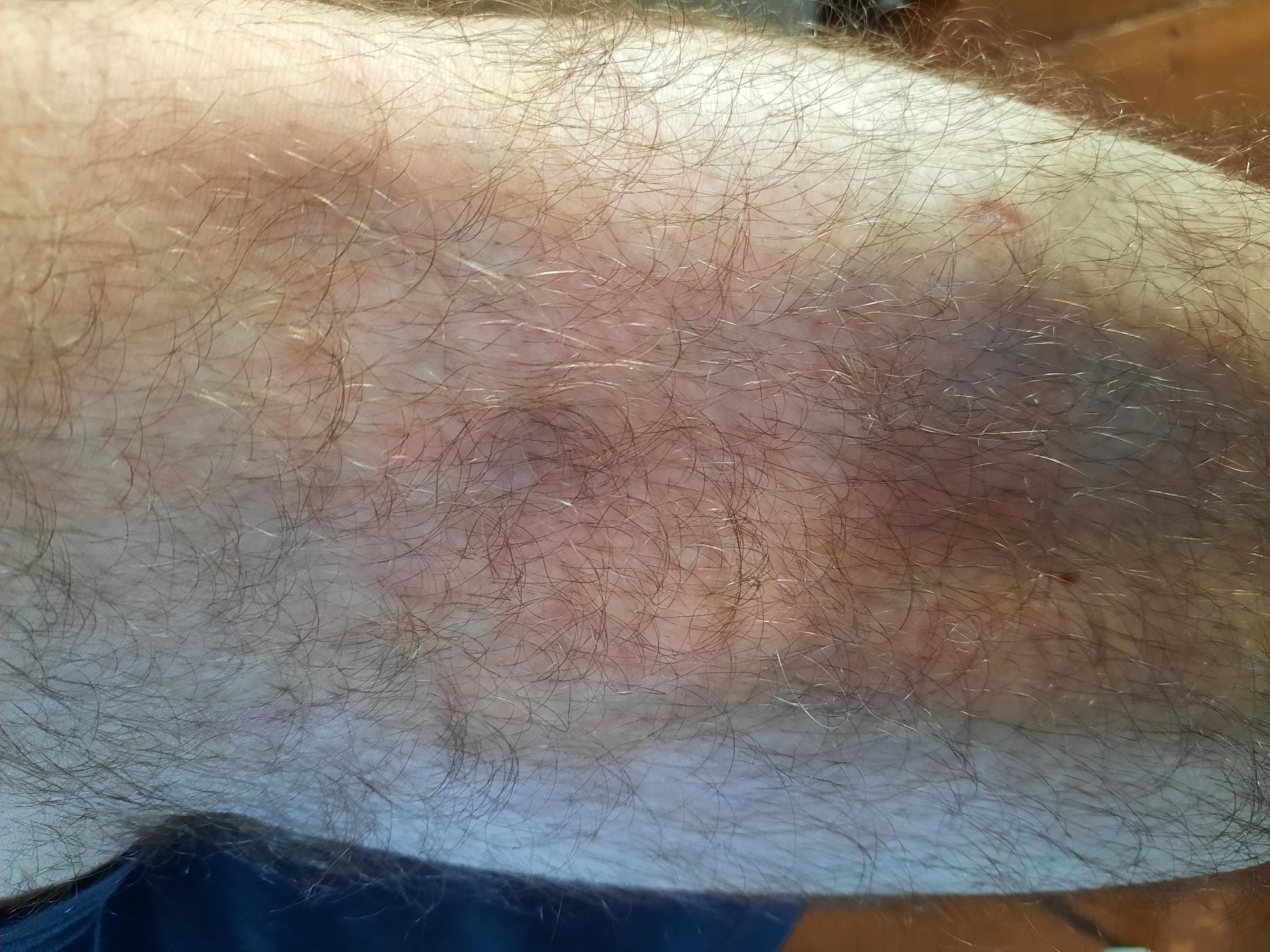 close-up of a Caucasian person's arm. The arm is covered in hair, and the skin appears red and irritated, potentially indicating a rash or skin condition. There is no information in the image or the description to ascertain the location of the person or the incident in the city of Krasnogorskoye, Russia.