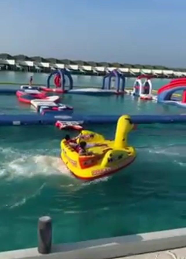 A person sits in the front of a yellow and red inflatable duck boat and rides in the water with another person in the back. The people move from left to right. In the background is an inflatable obstacle course on the water. Further back are small cabin-like structures on stilts. The sky is blue.