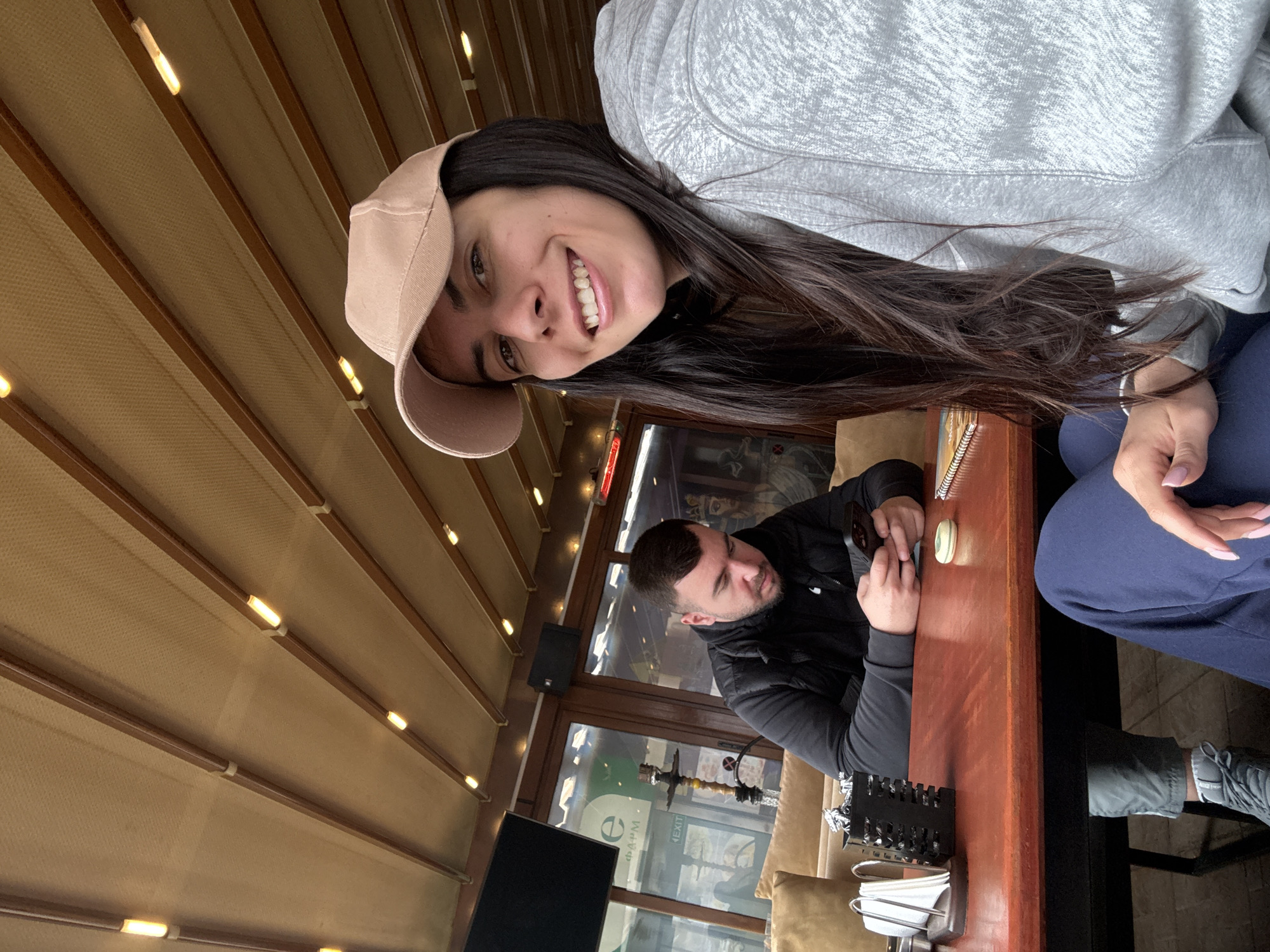 two people seated at a wooden table in what appears to be an indoor or semi-indoor space, possibly a cafe or restaurant. A young woman with long, dark hair and a tan baseball cap is in the foreground, smiling at the camera. She is wearing a gray hooded sweatshirt and blue pants. To her right, at the same table, is a man in a black jacket, looking at his mobile phone. The setting includes a ceiling with beams and integrated lights. A hookah and a TV screen are visible in the background. The table also has a notepad, a small round object, and a container with items like napkins. A speaker is mounted on the wall. Based on the Cyrillic text "ФАРМ" visible through the window, there is a high probability that this location is in Sofia, Bulgaria.