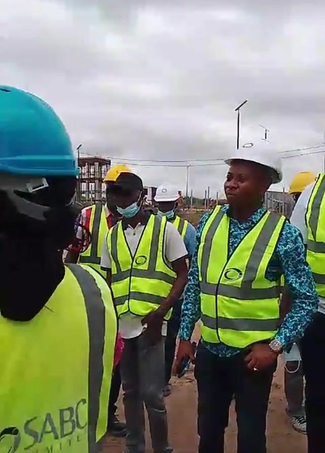 A group of individuals wearing safety vests and hard hats are gathered outdoors. Some are also wearing face masks. They appear to be at a construction site, indicated by the unfinished building in the background. The sky is overcast. The individuals are looking around, presumably observing the construction progress. Some members of the group are talking and discussing while holding papers, possibly blueprints or plans. The individuals are dressed in a mix of casual and semi-formal attire.