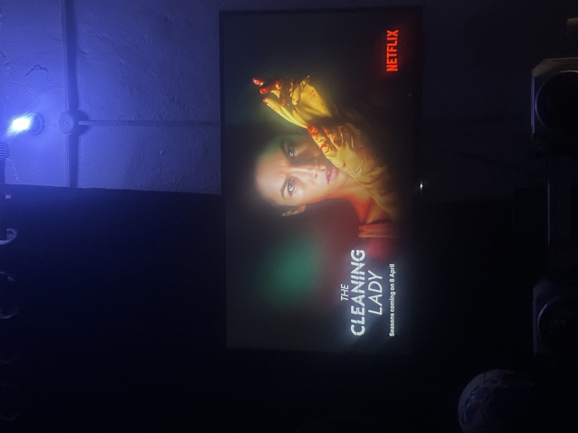 The image depicts an indoor scene in the city of Jos, Nigeria, focused on a television screen displaying a promotional image. The room is dimly lit, with a primary light source being a bright, blue-toned LED bulb mounted on the upper wall/ceiling towards the right side of the frame. This light illuminates a textured, pale-colored wall, revealing sections of white electrical conduit and a junction box. Dark fabric or a curtain is visible to the upper left. The central subject is a flat-screen television showing the title card for "THE CLEANING LADY." The screen displays a woman with dark hair and a serious, direct gaze, wearing yellow rubber gloves stained with a dark red substance, consistent with blood. Her left hand is prominently featured, holding up the gloved right hand. The background of the screen image shows a green light or haze on the left and a red/orange light or haze on the right. Below the title, the text "Seasons coming on 8 April" is visible, along with the red "NETFLIX" logo in the bottom right corner of the screen. In the foreground, below the television, parts of dark objects are discernible. To the bottom left, a spherical item, possibly a globe or decorative ball, is partially visible. To the bottom right, a section of what appears to be an audio speaker or electronic device is present. The immediate area around the TV and the lower foreground is largely obscured by shadow.