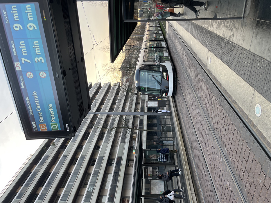 The image captures a tram station with a tram approaching. The display shows that it is February 3, 2026, at 17:03. The next tram to Gare Centrale (line C) arrives in 7 minutes, followed by one in 9 minutes. Trams to Poteries (line D) arrive in 3 and 9 minutes. Passengers wait at the station. A tall building stands nearby, towering above the tram.