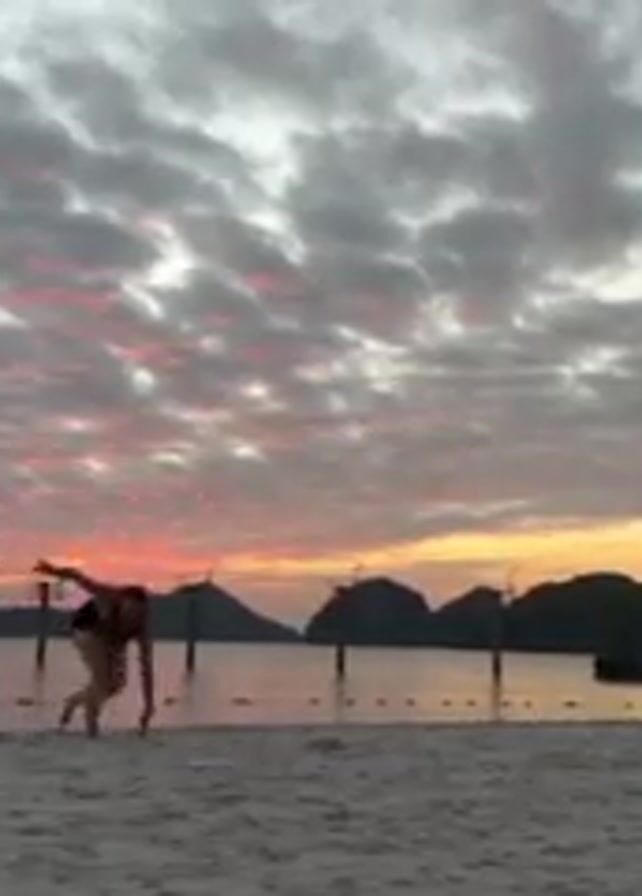 A woman is throwing a frisbee on a beach at sunset. The woman is wearing a black sports bra and black shorts. She throws the frisbee and then picks it up after it falls. There is a pier in the background, and some islands in the distance. The sky is filled with colorful clouds. There are other people on the beach.