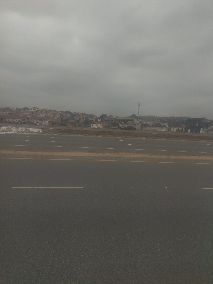 view of a paved road from a car. The road has white lines painted on it. In the distance, there is a small suburban area with several buildings and a cell phone tower. The sky is overcast with grey clouds. There is a slight haze or fog in the air. The view is from a road in Aso, Nigeria, located at the coordinates latitude: 9.043, longitude: 7.541.