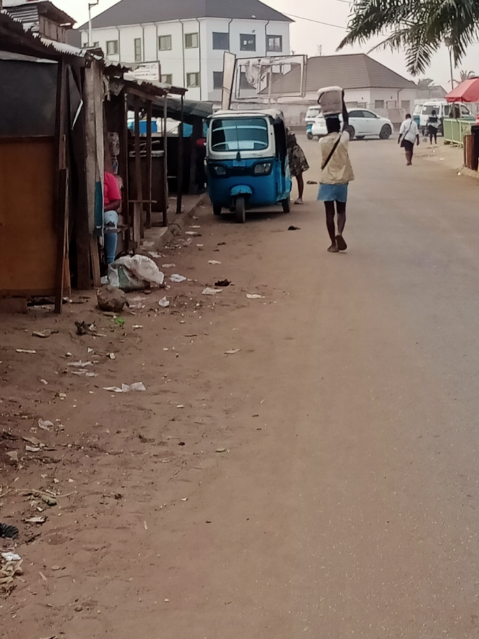 A road in an urban area depicts a woman carrying a bucket on her head, walking away from the camera. Nearby, a blue and white tricycle is parked near makeshift structures. Litter scatters the roadside. In the background, other people walk along the road, past parked cars and buildings. The sky is overcast.