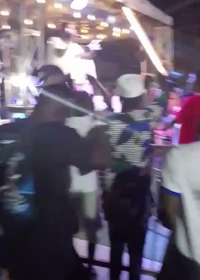 nighttime outdoor concert with a small stage where two men, possibly singers, are performing. They are lit by stage lights and surrounded by other men, presumably their crew. A crowd of people is watching the performance, many of whom are moving and dancing to the music. The video is shaky, giving a sense of movement and energy. The environment is dark, typical of a nighttime concert.