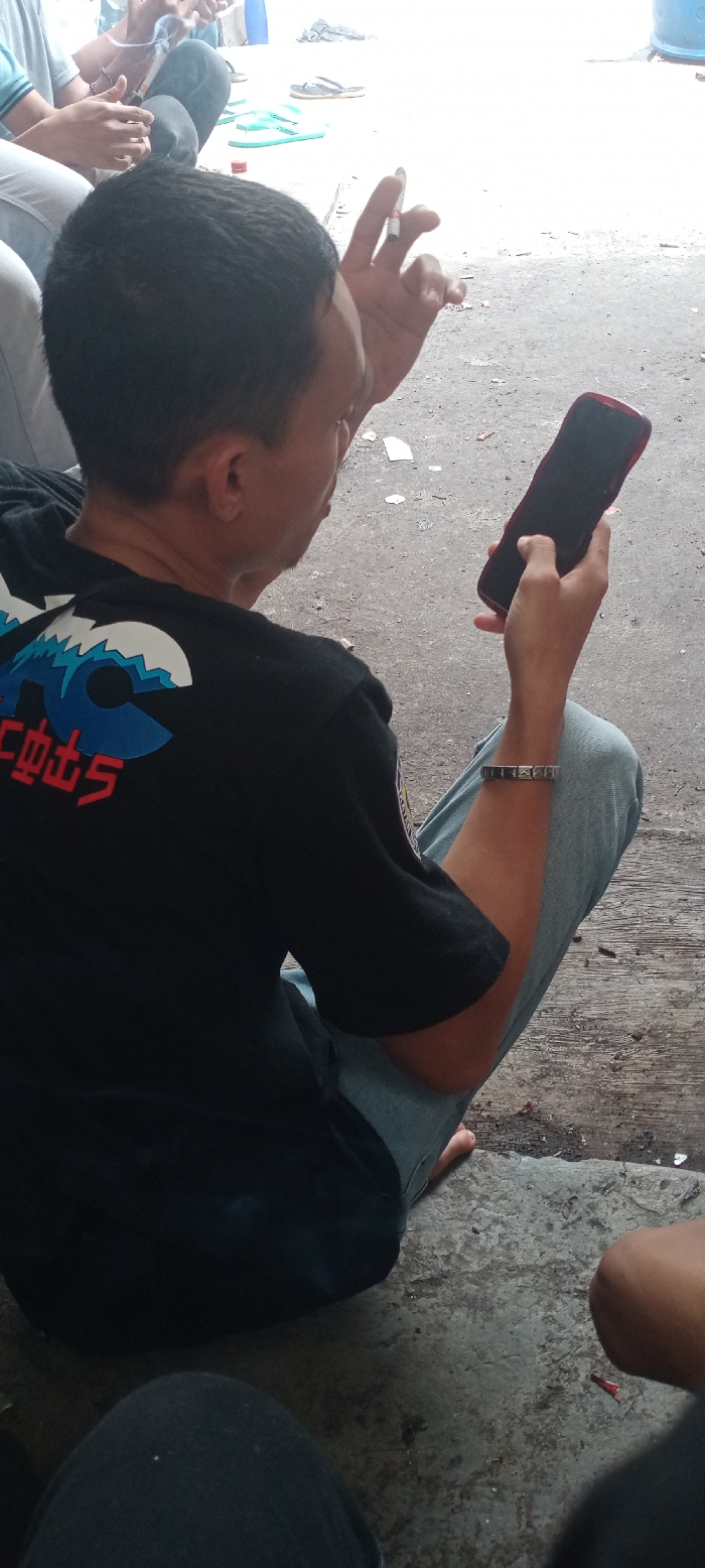 An image taken in Cilampeni, Indonesia, depicts a group of individuals seated on a rough, grey concrete surface. The primary subject is a male, viewed from behind and slightly to his right. He wears a black short-sleeved t-shirt with a white and blue wave graphic above red characters, light blue jeans, and a dark studded bracelet on his left wrist. He holds a dark-colored smartphone with a red case in his right hand, actively engaging with the screen, and a lit cigarette between the index and middle fingers of his left hand. To his left, another individual is partially visible, wearing light-colored pants and a light blue shirt, with their hands clasped. In the immediate foreground, the knees of a third individual are visible. In the background, on the concrete, light blue and dark flip-flops are visible, along with a red bottle cap and scattered debris. A blue barrel is partially visible in the upper right background.