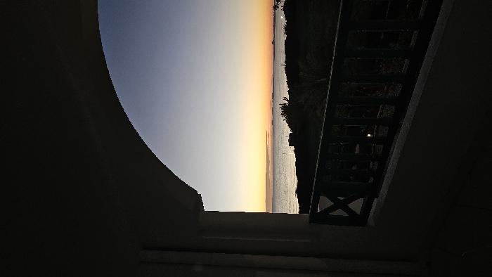 Captured from within a dark, arched structure, the image reveals a vibrant sunset over a body of water. The horizon is marked by a transition from light yellow to orange. A dark silhouette of trees and buildings line the shore. A wooden railing is visible on the right, juxtaposing the natural scene with a man-made structure. The light of the sunset reflects off the water's surface, creating a shimmering effect.