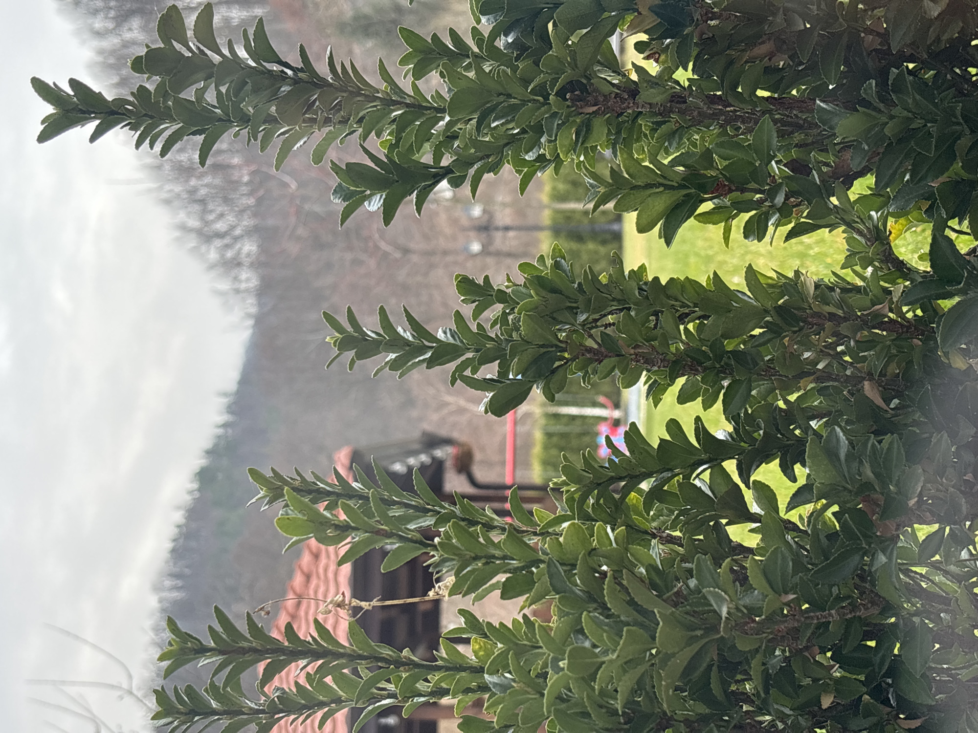 The image depicts an outdoor scene located in Gabrovo, Bulgaria. The foreground is occupied by a dense row of sharply focused dark green evergreen shrubs. Behind these shrubs, to the left, a portion of a building featuring a reddish-brown tiled roof and dark wooden eaves is visible. Centrally and to the right, a bright green lawn extends, on which elements suggestive of a children's playset are faintly discernible, and two dark-colored streetlights or garden lamps stand further in the distance. The background consists of a blurred, treed mountain slope under an overcast, light gray sky, with the trees appearing leafless. No individuals, discernible actions, or interactions are present in the frame.