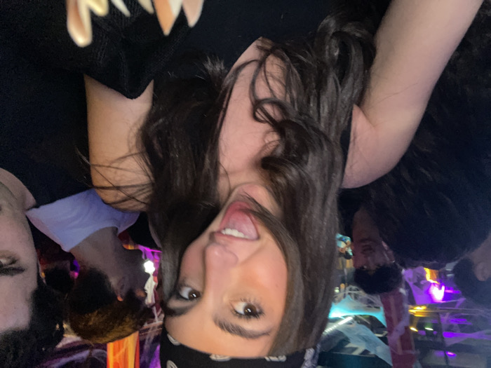 The image depicts an indoor social gathering, possibly a nightclub or party, located in Lattes, France. The scene is characterized by dim, multi-colored artificial lighting (predominantly purple, blue, and orange/red) and decorative elements, including draped fabric or streamers hanging from above. The primary subject is a young female, approximately 18-25 years old, positioned centrally and close to the camera. She has long, dark brown hair and wears a black bandana with white patterns on her head, along with a black v-neck top. Her expression is playful, with her mouth open and tongue slightly extended as she looks directly towards the viewer. Her right arm is visible, holding a dark object, possibly a garment or bag, with some lighter-colored accents. In the background, multiple individuals are present. To the left of the central female, a young male with dark, curly hair, wearing a dark shirt, is partially visible, looking towards the right side of the frame with a neutral expression. Another indistinct figure is further back on the left. To the right, a portion of a male's face is visible at the extreme edge of the frame. Behind the central female and to her right, another young male, wearing a white t-shirt, is seen with his back partially turned to the camera. The overall environment appears crowded. No direct interactions between the background subjects are discernible; they are situated within a dynamic, low-light social setting.