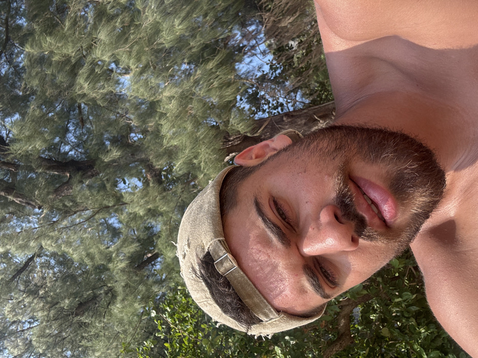 A male individual with a dark beard, mustache, and short dark hair is depicted in a close-up, selfie-style photograph. He is wearing a distressed, light tan baseball cap backward and is shirtless, revealing tanned skin on his face, neck, and shoulders. His gaze is directed forward, toward the camera. The background consists of dense green foliage from large trees with thin, needle-like leaves, characteristic of Casuarina species, under a bright blue sky. This tropical coastal vegetation and environment are consistent with locations found in Ban Ao Nang, Thailand.