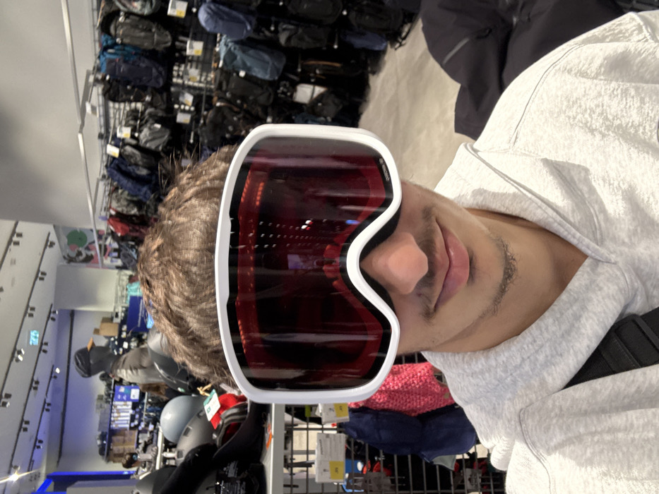A person wearing white-rimmed ski goggles with red lenses stands in a store