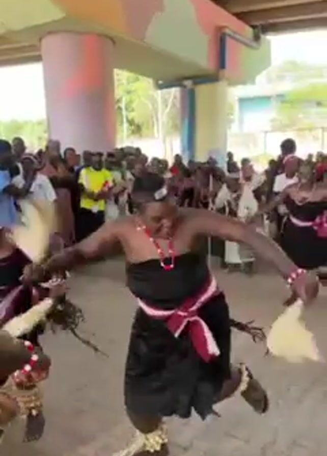 group of women dancing outdoors, under what appears to be a highway overpass. The overpass has colorful decorations on the pillars. The women are wearing similar outfits consisting of black fabric wrapped around their bodies, red beaded necklaces, and red and white belts. Some of them also have white objects attached to their wrists. They are moving in a circular pattern. A man is playing a drum on the side. There are other people standing around watching the dance, some wearing safety vests. The setting appears to be a public space.