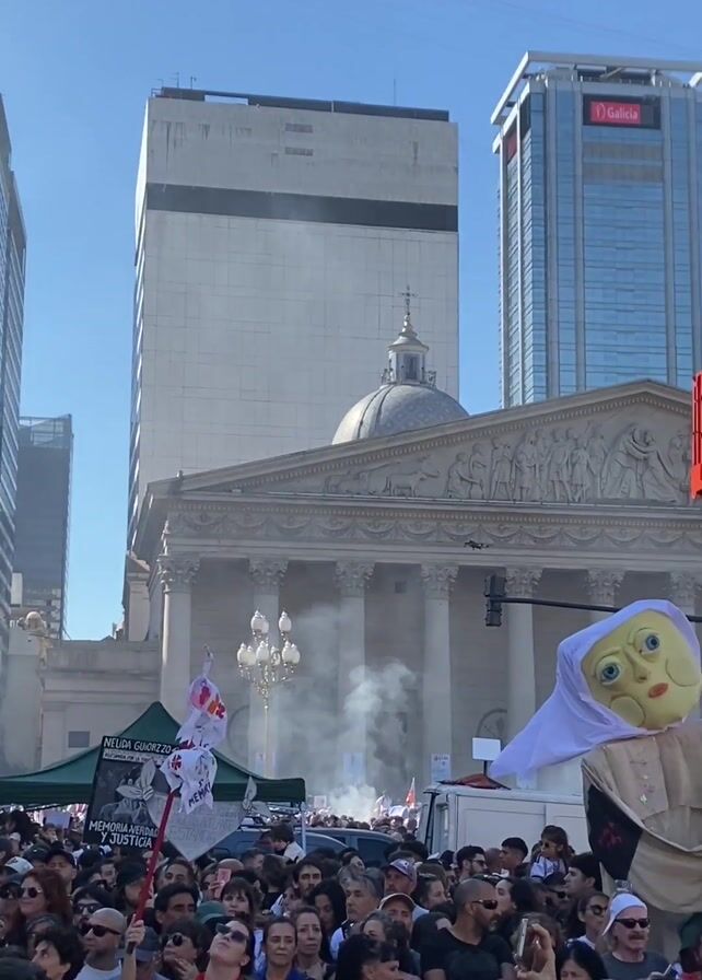 In the video, a dense crowd has gathered in a city square, with a large building visible behind them. The foreground contains many people facing the camera, some holding signs and banners. In the middle ground, a large puppet resembling an older woman is visible with an Argentine flag. The puppet is positioned near an elevated platform that holds a camera crew. In the background, there are tall buildings, including one labeled "Galicia." The atmosphere is lively and bustling, suggesting a public gathering or demonstration.
