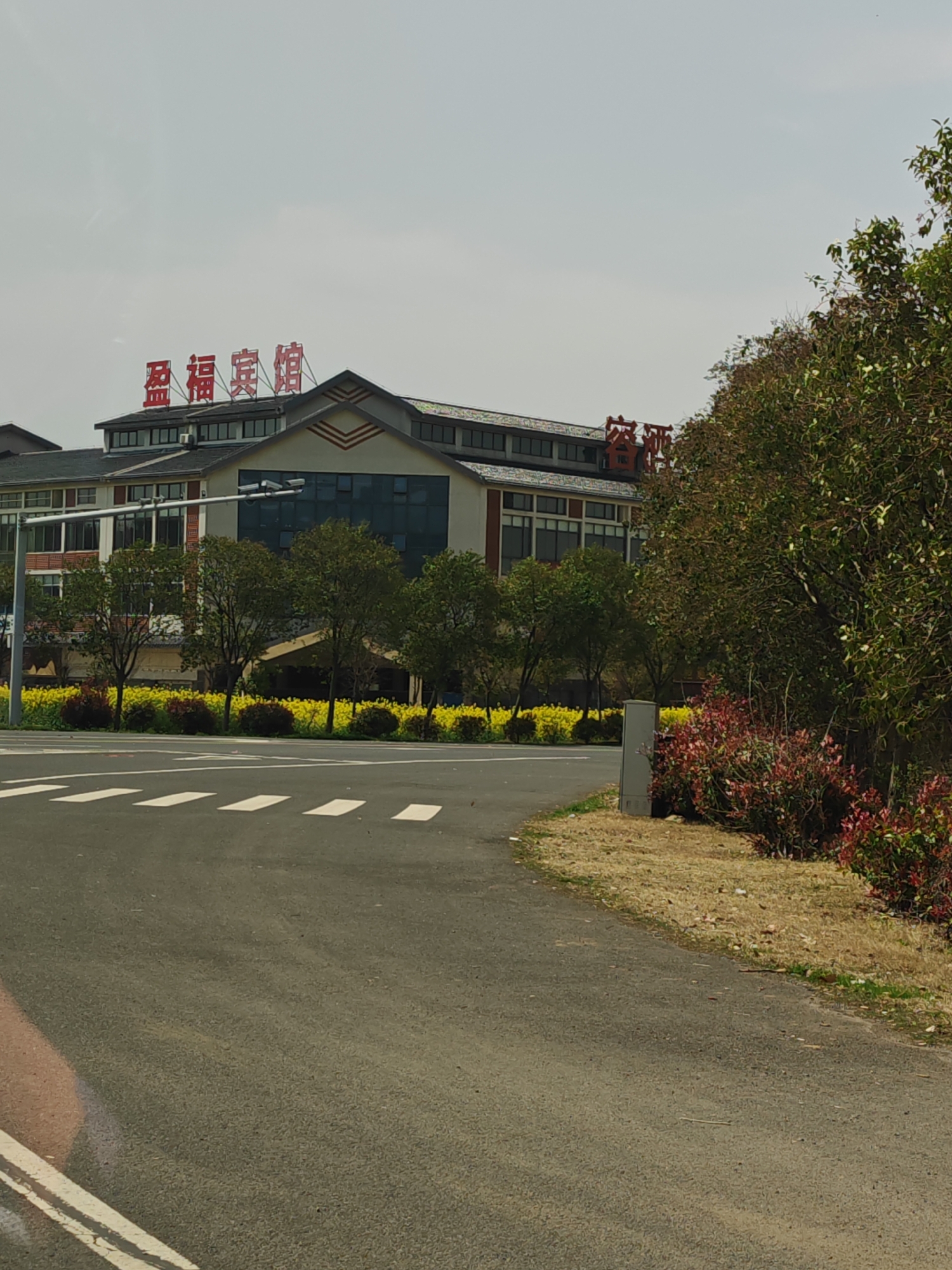 The image presents an outdoor scene in Jurong, China. In the upper-middle ground, a multi-story building is identifiable by prominent red rooftop signage reading "盈福宾馆" (Yingfu Guesthouse/Hotel). The structure features a grey tiled roof, beige and red-brick facade elements, and multiple dark-tinted windows across its stories. A street light pole with a horizontal cross arm is positioned left of the building, above a strip of yellow flowering plants. An asphalt road with a marked pedestrian crosswalk (white rectangular stripes) occupies the foreground and midground. A median strip between the road and the building contains a dense field of yellow flowering plants, consistent with rapeseed, interspersed with small green trees and bushes. To the right of the road, a strip of dry, light-brown grass precedes dense vegetation, including tall green trees and bushes with red foliage. A grey utility box is partially visible within the right-side foliage. The sky is uniformly light grey, suggesting overcast conditions or atmospheric haze. No human figures or active interactions are present in the scene.