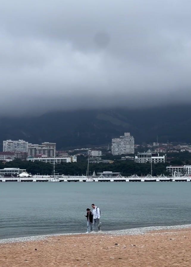 couple walking along a beach. The beach has light brown sand and a small strip of pebbles at the water's edge. Behind the water, there is a boardwalk-style pier that stretches horizontally across the scene. Further back is a cityscape with mid-rise buildings, and behind the city looms a large mountain covered in dark clouds. The sky is overcast with gray clouds. The couple starts out walking together, then one person walks ahead while the other follows.