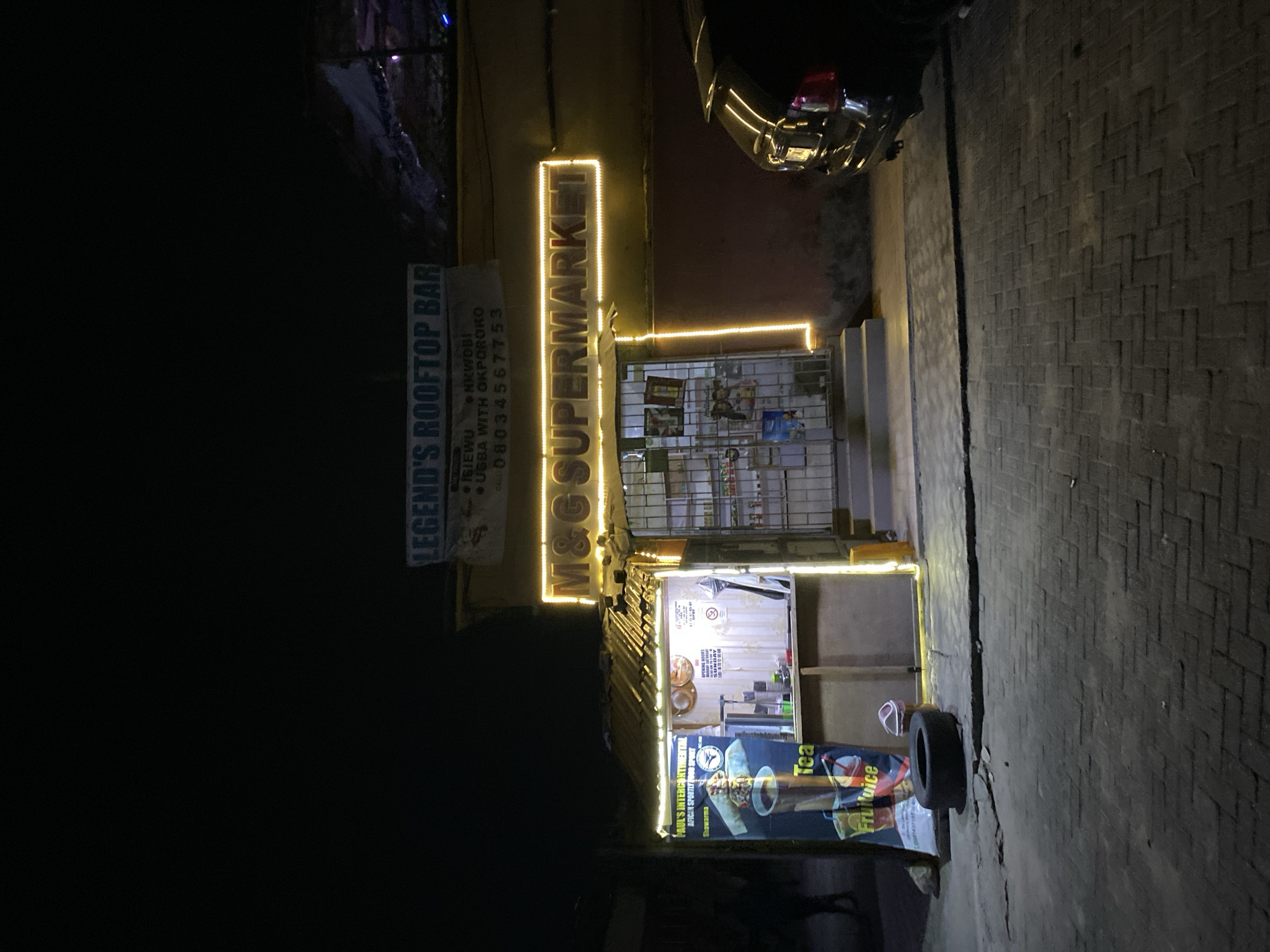 Here is a detailed description of the image: The image depicts a nighttime scene, likely a street in Ado, Nigeria, showcasing a small commercial setup with illuminated signage. On the left, there is a sign for "LEGEND'S ROOFTOP BAR", advertising "ISIEWU, NKWOBI, UGBA WITH OKPOROKO" and a phone number. Adjacent to it is a sign that reads "M&G SUPERMARKET" with illuminated borders. Below this is a smaller establishment featuring "PAUL'S INTERCONTINENTAL AFRICAN SPORTLY" advertising "Shawarma", "Tea" and "Fruitjuice". The opening hours for Sunday are also listed. The surrounding environment is dark, with visible textures on the brick or concrete wall. A car partially appears at the top right corner. A tire is lying on the ground in front of Paul's Intercontinental stand.