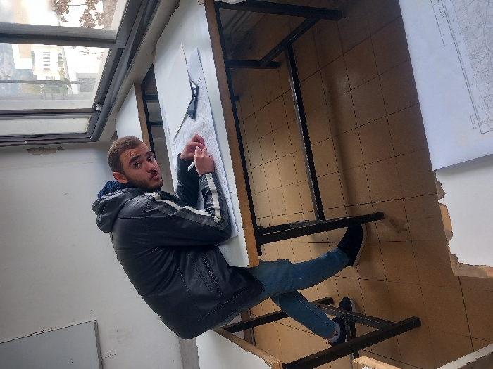 The image displays a male individual leaning over a drafting table inside a room located in the City of Rukn ad-Din Municipality, Syria