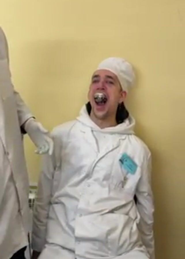 The scene shows two people in white lab coats. One of the people is kneeling and has a dental impression tray filled with a gray material in their mouth. The person kneeling is wearing a white surgical cap and a hooded sweatshirt under the lab coat. They have long dark hair. The second person is standing next to the kneeling person and holding a gloved hand out with what appears to be more impression material. The background is a pale yellow wall.