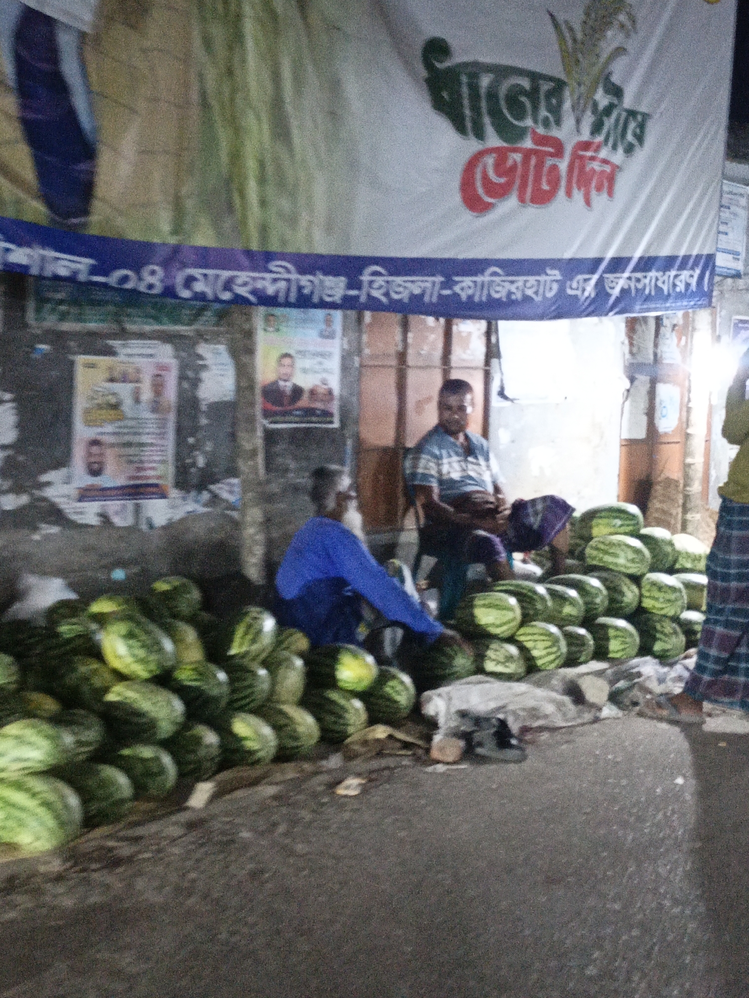 - "This image depicts an outdoor market scene, likely a roadside stall, in the city of Kauria, Bangladesh, specifically within a constituency encompassing Mehendiganj, Hizla, and Kazirhat, as indicated by overhead banners" by FM-xENTm1, licensed under CC BY 4.0