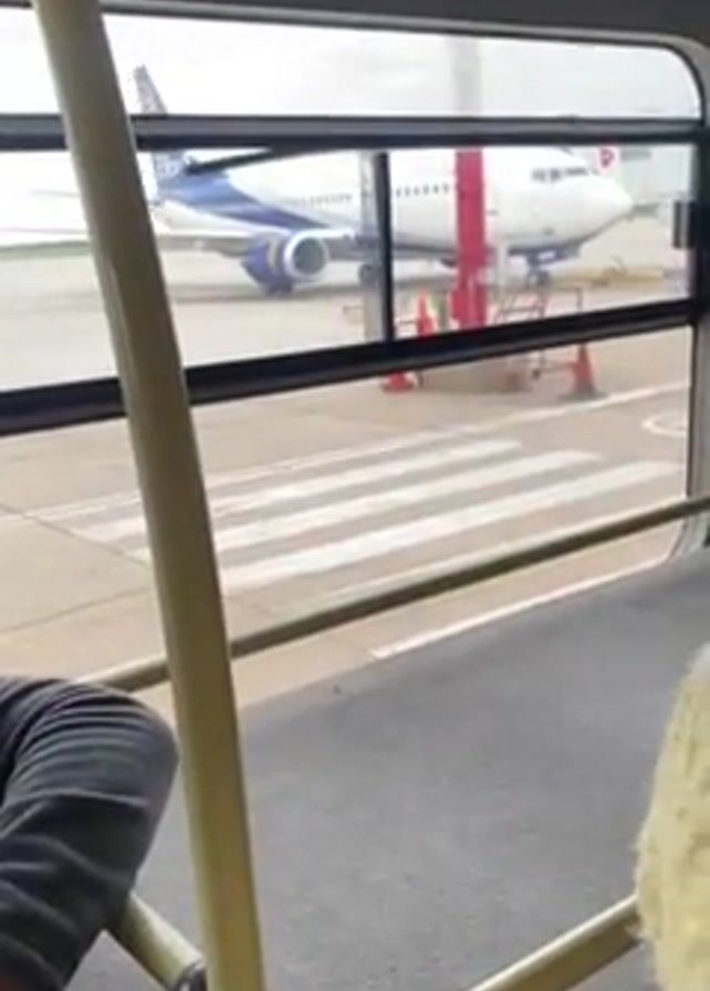 The view from inside a bus, possibly at an airport, shows an airplane parked outside a window