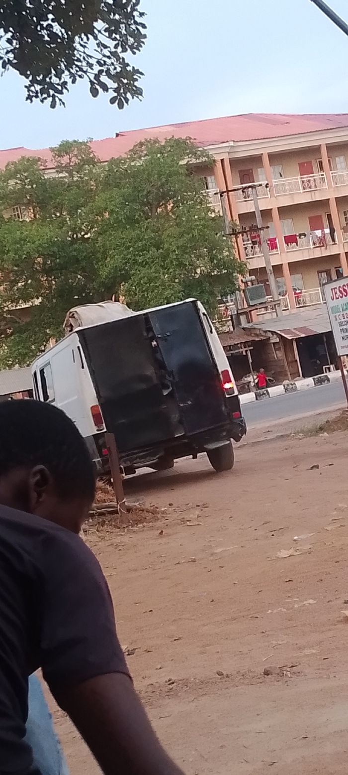 The image depicts a street scene in Adankolo, Nigeria, characterized by both developed and unpaved areas. In the immediate foreground, the back of an individual's head and right shoulder are visible, facing away from the camera, on a reddish-brown dirt surface. A white panel van with prominent black rear doors, one of which appears partially open or damaged, is parked or stopped at an angle in the mid-ground. A light-colored tarp or covering is secured on the van's roof, and its left taillight is illuminated. The van is situated on an unpaved shoulder next to a paved road with a white and black striped curb. Across the paved road, a small, rudimentary structure with a corrugated metal roof stands, and a person dressed in a red shirt is visible near it. To the right of this structure, a sign partially reads "JESSICA MODEL ACADEMY." In the background, a large, multi-story building with a reddish-pink corrugated metal roof and multiple balconies with white railings dominates the skyline. Clothes are observed hanging on several balconies. Lush green trees are interspersed throughout the scene, partially obscuring the buildings and utility infrastructure. The sky overhead is a clear, light blue.