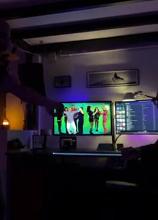 person dancing to a music video playing on a large screen in a dimly lit room. The room has a desk with two monitors, and another person is sitting at the desk using the computer. The dancer is moving their arms and body in sync with the music. The music video on the screen features various people dancing in front of colorful backgrounds. The room has a casual and personal feel, with decorations and lighting.