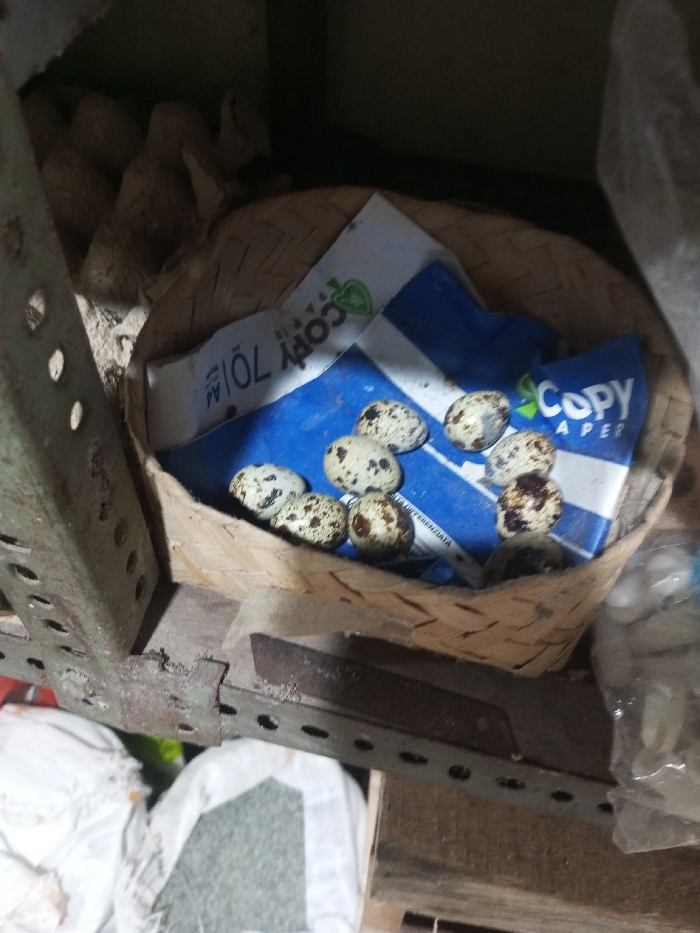 - "A woven basket containing speckled quail eggs sits on a metal shelf, lined with discarded "Copy Paper" packaging" by FM-QXFPH2, licensed under CC BY 4.0
