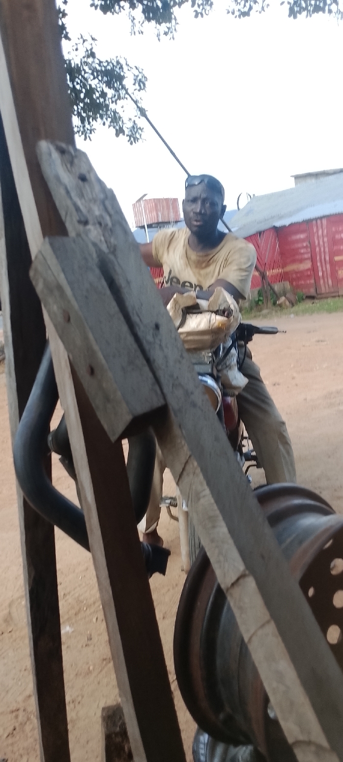 The image portrays an outdoor scene in Adankolo, Nigeria. A male individual, appearing to be an adult with dark skin and short dark hair, is positioned in the mid-ground. He wears a pair of sunglasses resting on his head, a dirty light brown short-sleeved t-shirt with a partial "Jeep" logo visible on the front, and light brown trousers. He is seated on a motorcycle, which features a red fuel tank and chrome accents. The man's hands are on the handlebars, holding a light-colored, possibly paper-wrapped, item. His gaze is directed forward, towards the viewer. The foreground is dominated by several rough-hewn timber planks, arranged vertically and diagonally, partially obscuring the motorcycle and man. A dark, curved metal pipe is also present in the immediate foreground, intertwined with the timber. In the lower right foreground, a large, dark metal wheel or pulley with circular perforations is visible. The ground surface is unpaved, appearing as dirt or sandy earth. In the background, several structures with corrugated metal roofs are visible, one of which exhibits red corrugated metal siding. A dark-leaved tree is present in the upper left portion of the image, against a bright sky, with a long, thin pole or rod extending diagonally upwards from the mid-ground. Further in the background, a large metal tank on a raised platform is discernible.