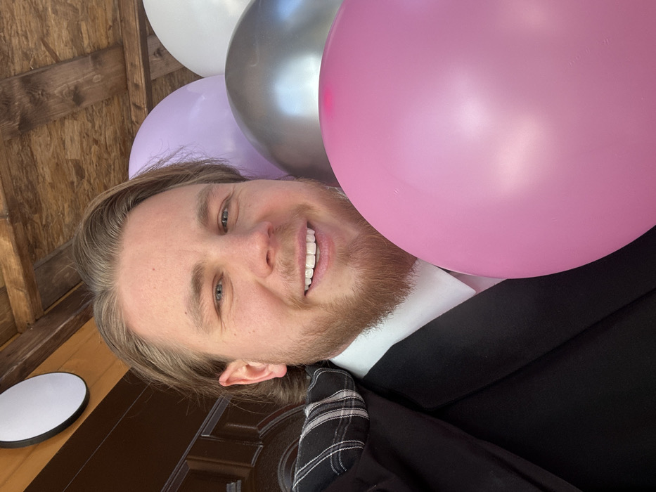 A Caucasian male, estimated to be in his mid-20s to early 30s, with light blonde hair swept back and a light reddish-brown beard, is depicted smiling directly at the viewer. His light-colored eyes are open, and his teeth are visible in the smile. He is wearing a white collared shirt and a black suit jacket. A dark, possibly black and white plaid pattern is visible over his left shoulder. He is positioned in front of a cluster of balloons, with a large pink balloon prominently in the lower right foreground. Behind the pink balloon, a metallic silver balloon, a light purple balloon, and a white balloon are partially visible. The background to the left reveals a dark brown door with a raised panel design, above which a circular white light fixture with a black rim is mounted on a light brown wooden wall. Above the subject and balloons, rough-hewn wooden beams, typical of a porch or overhang structure, are visible. The scene takes place in Старт-2 Снт, Russia.