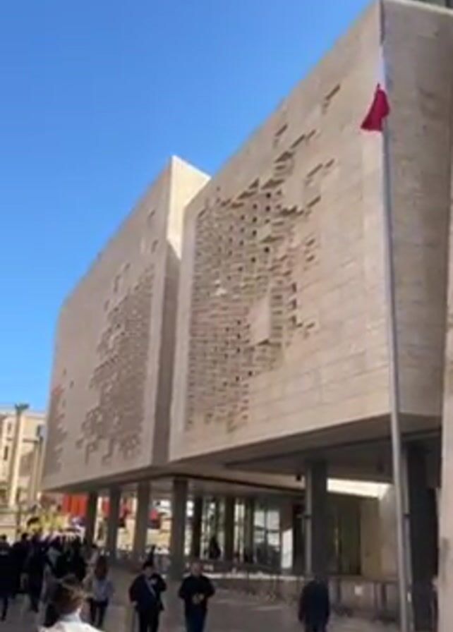 public square in what appears to be a city. The scene is dominated by a modern building with a facade made of light-colored stone, featuring a textured pattern. A Maltese flag flies on a pole in front of the building. The square is bustling with people walking around. A large, decorated Christmas tree stands prominently in the square. There is a banner on a building across from the tree which reads "#Justice for Jim Rice". The sky is clear and blue.