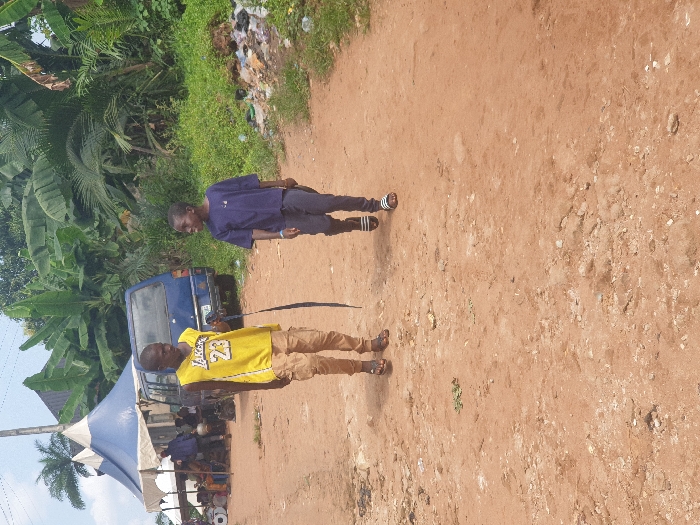 This image depicts an outdoor scene in Nkpor, Nigeria, featuring two young males walking on an unpaved dirt path