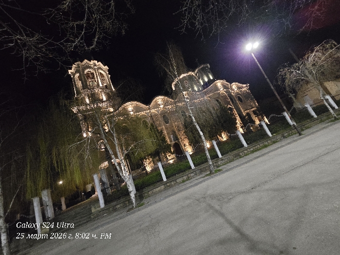 The image displays the Church of the Holy Trinity in Svishtov, Bulgaria, at night. The prominent, ornate stone or stucco church structure features a tall bell tower on the left and multiple domes, all illuminated by numerous warm-toned spotlights. A black metal fence with white vertical posts encloses the church grounds, behind which a row of slender trees with mostly bare branches stands. An asphalt road occupies the lower right foreground. On the right, a tall street light with a bright, purplish-white double luminaire illuminates the immediate area. The sky is dark, with silhouetted bare tree branches visible at the top. No individuals or moving subjects are present. A timestamp overlay in the lower left indicates "Galaxy S24 Ultra 25 март 2026 г. 8:02 ч. PM".