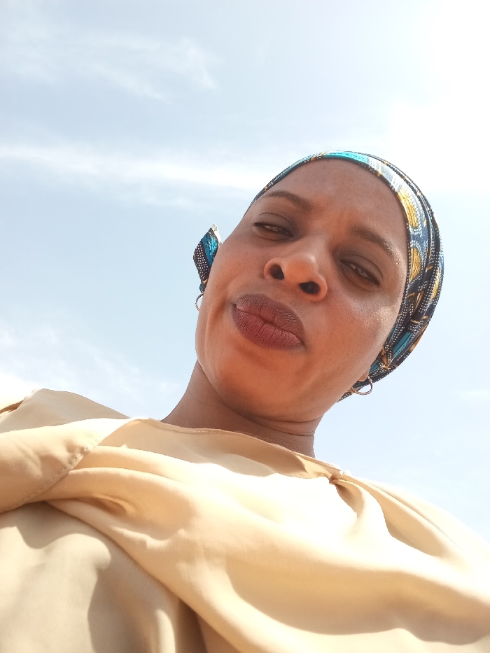 An upward-angle shot depicts an adult female against a clear, light blue sky with faint cirrus clouds. She wears a multi-colored headwrap with blue, gold, and dark blue/black patterns, along with a light beige or tan garment visible over her shoulders and upper chest. Small, silver-colored hoop earrings are present in both ears. Her face is centered, eyes open, and her lips are slightly pursed. The subject appears to be outdoors in Kakau, Nigeria.