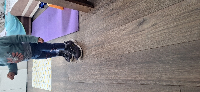 An indoor scene in a room within the city of Studena, Bulgaria, depicts a child standing on dark brown wood-grain laminate flooring
